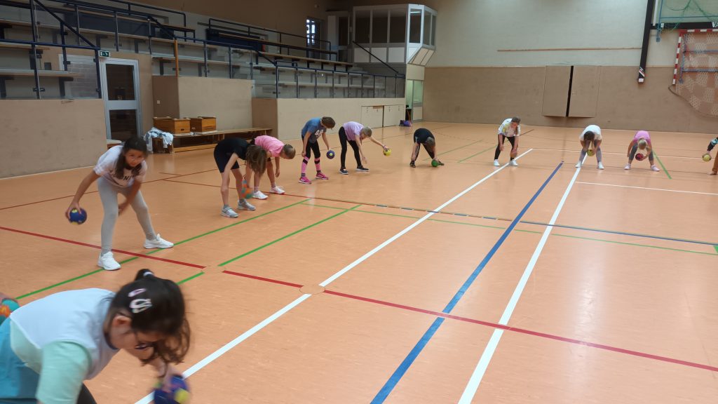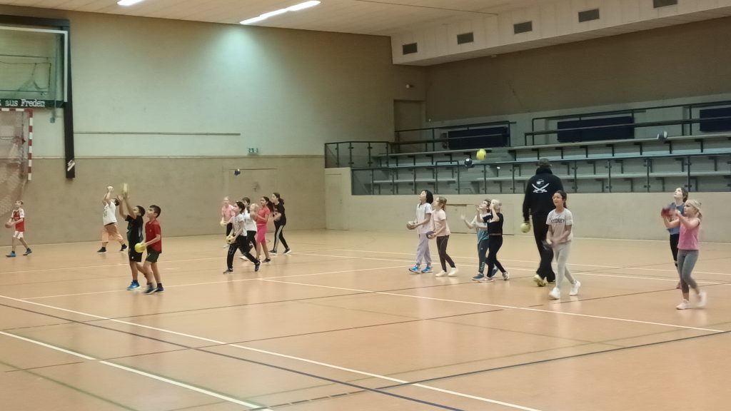 Nach einem gemeinsamen Spiel zur Erwärmung wurde das Fangen und Werfen in verschiedenen Varianten (allein, mit Partner, in Bewegung, an die Wand) sowie das Prellen am Ort, in Bewegung, rechte/linke Hand/im Wechsel geübt.