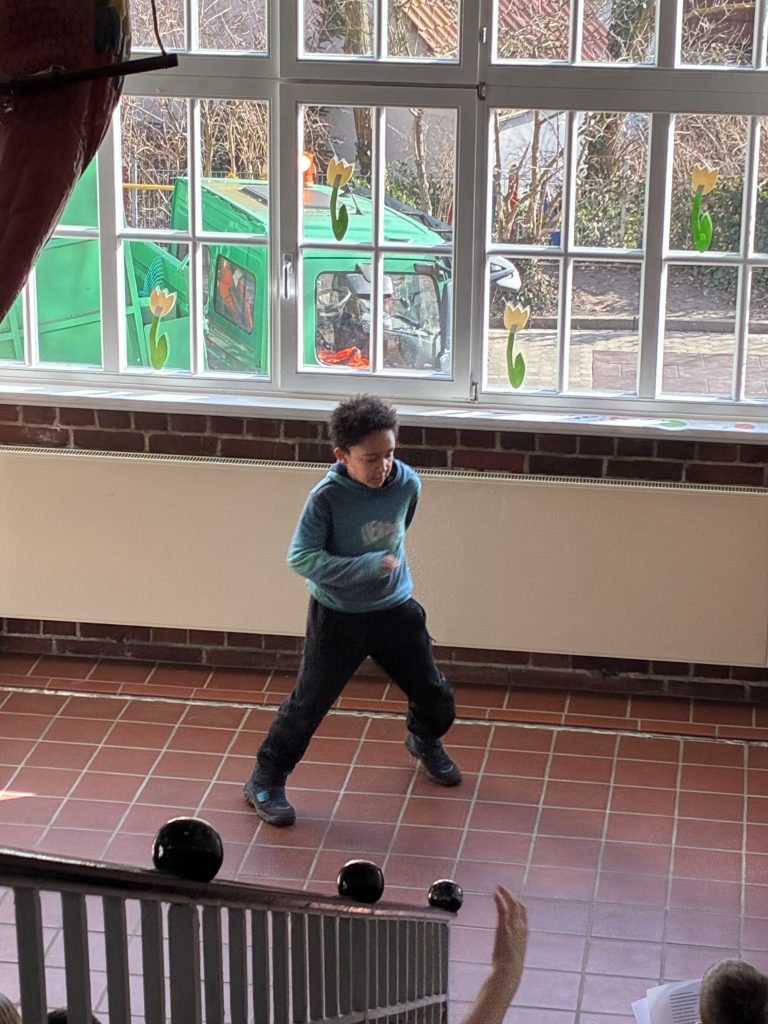 Zunächst haben Xi Yu, Zhong Yu und Lene klassische Musik auf dem Keyboard präsentiert. Es folgte Juna mit einer selbstgeschriebenen Geschichte. Dann präsentierte Erik eine Zaubershow und Marlene zeigte ein Bild, dass sie selbst gestaltet hat. Mykhailo präsentierte uns ein Gedicht in seiner Muttersprache Ukrainisch. Zwei Mädchengruppen zeigten uns ihre selbst erarbeiteten Choreografien im Kunstturnen und zum Abschluss tanzte David für uns. Abschließend wurden die Pausenengel des letzten Halbjahres für ihre Arbeit geehrt.