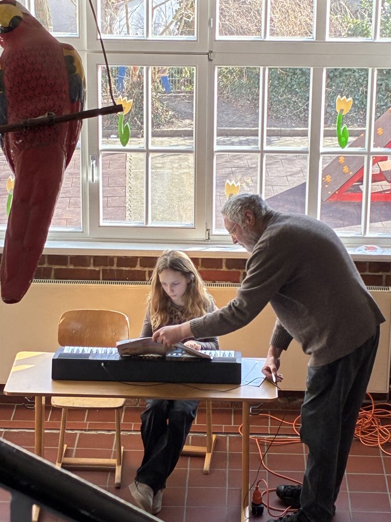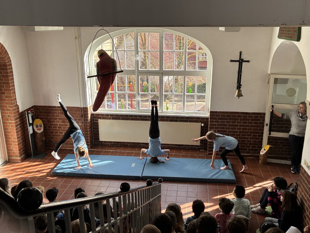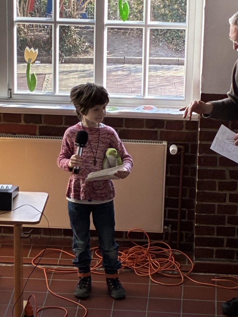Zunächst haben Xi Yu, Zhong Yu und Lene klassische Musik auf dem Keyboard präsentiert. Es folgte Juna mit einer selbstgeschriebenen Geschichte. Dann präsentierte Erik eine Zaubershow und Marlene zeigte ein Bild, dass sie selbst gestaltet hat. Mykhailo präsentierte uns ein Gedicht in seiner Muttersprache Ukrainisch. Zwei Mädchengruppen zeigten uns ihre selbst erarbeiteten Choreografien im Kunstturnen und zum Abschluss tanzte David für uns. Abschließend wurden die Pausenengel des letzten Halbjahres für ihre Arbeit geehrt.